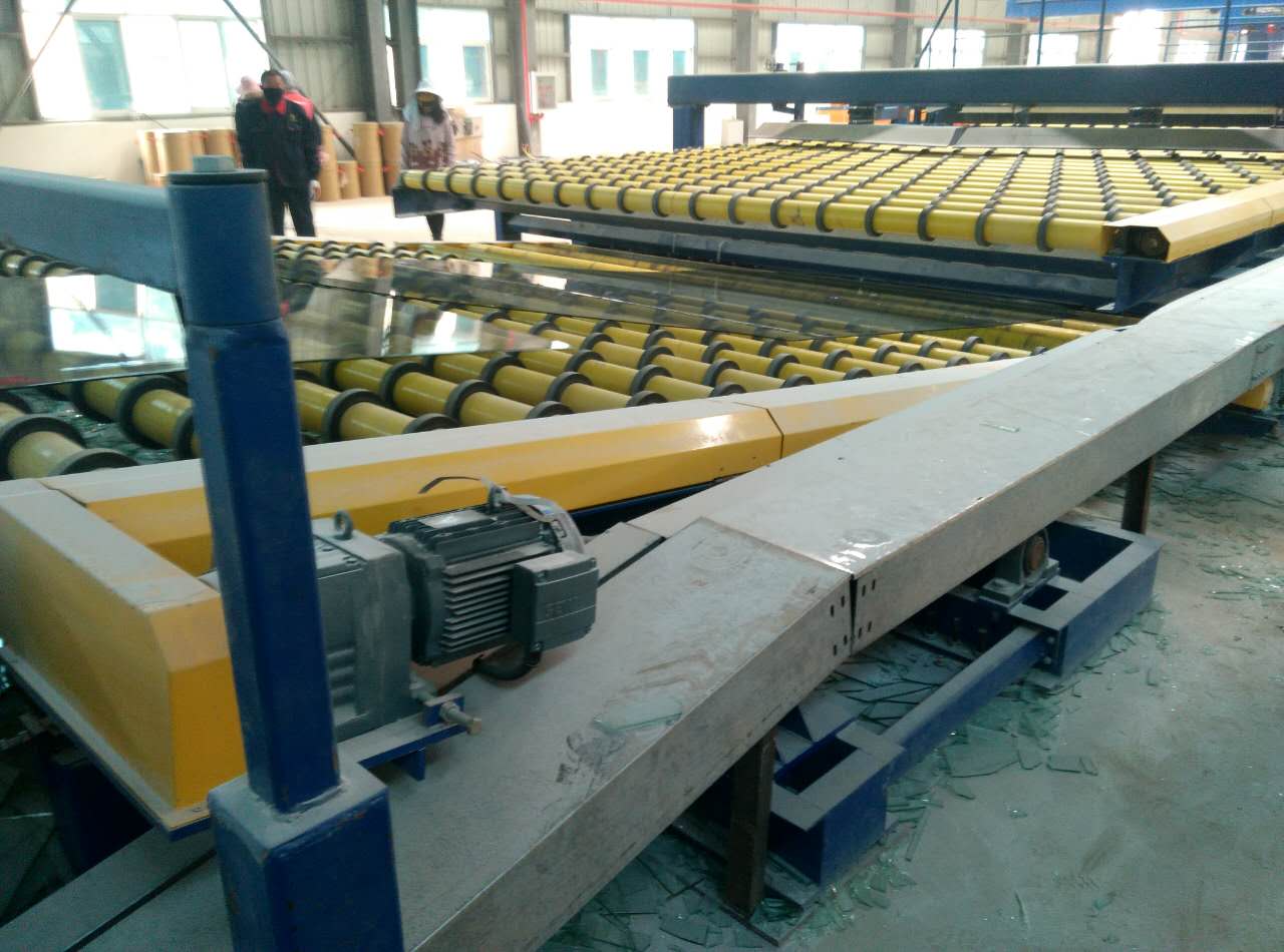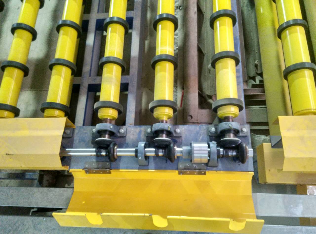 在云南云騰建材600噸浮法冷端項目上,玻機公司成功設計出末輥可超越式主線落板。該設備減少了末輥損壞周期,降低了對末輥的磨損。主要原理是在傳動通軸上,末輥與倒數(shù)第二支輥子之間的位置斷開,按照轉速和轉矩等參數(shù)設計了超越離合器。正常輸送時,末輥如同普通輥子;需要落板時,超越離合器會實現(xiàn)末輥的線速度跟隨主線接板輥道的線速度,從而減小因速度差導致的玻璃板對末輥的磨損。現(xiàn)該設備在云騰600噸冷端線上運轉良好。