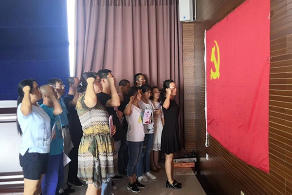 二是重溫入黨誓詞。全體黨員胸前佩戴黨徽,神情莊重、精神飽滿,面對鮮紅的黨旗,高舉右拳。在支部副書記陳海瑩的帶領下,大家的錚錚誓言、鏗鏘有力,響徹會議室。12句話,80個字,句句千斤,字字如磐,展示了大家堅定不移的政治信念和矢志奮斗的堅強決心。