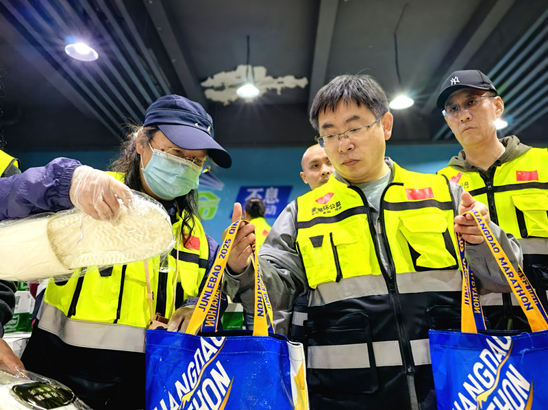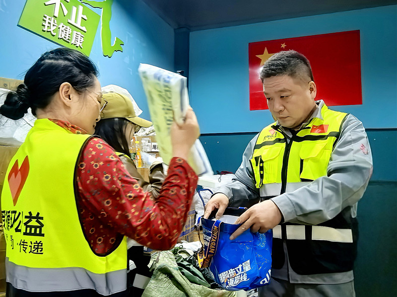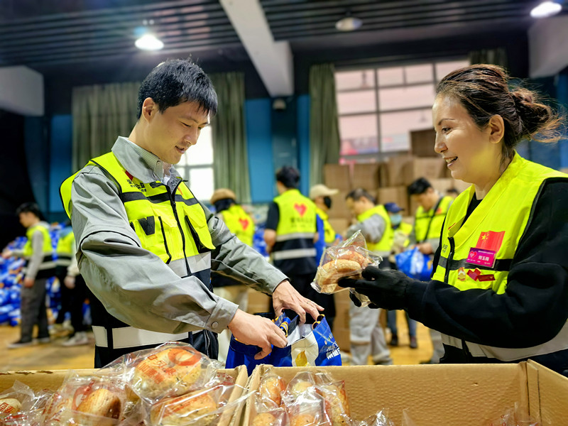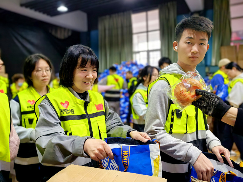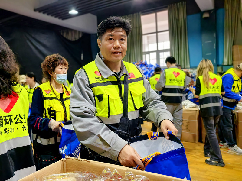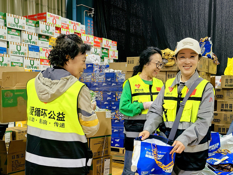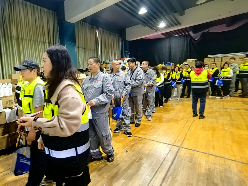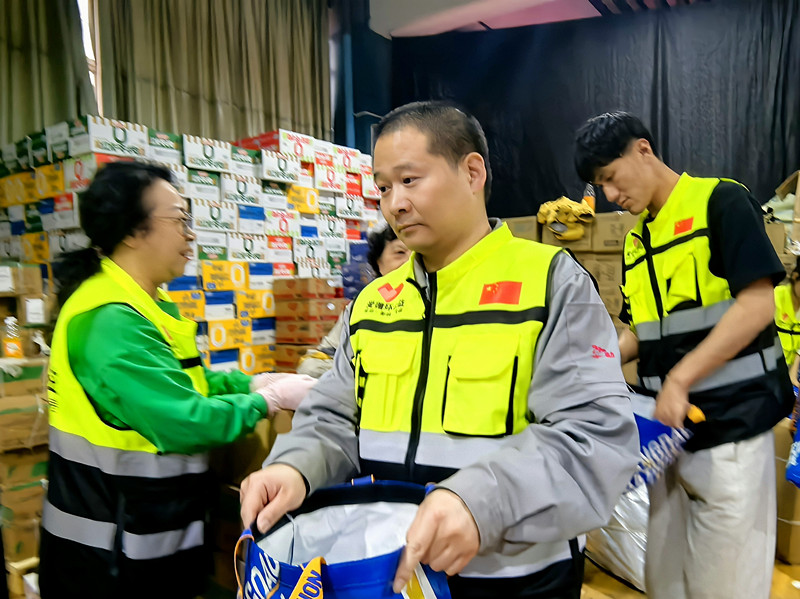 在市體育局物資倉(cāng)庫(kù)內(nèi),玻機(jī)黨員們與愛(ài)循環(huán)公益團(tuán)隊(duì)緊密協(xié)作,高效完成賽事物資分裝任務(wù)。現(xiàn)場(chǎng)采用“循環(huán)流水線”作業(yè)模式:志愿者們排成環(huán)形隊(duì)伍,依次領(lǐng)取物資袋,有序裝入面包、火腿腸、礦泉水等賽事補(bǔ)給品,形成高效運(yùn)轉(zhuǎn)的“人力傳送帶”。部分黨員主動(dòng)承擔(dān)搬運(yùn)工作,將閑置紙箱整理裝車,確保場(chǎng)地整潔安全。